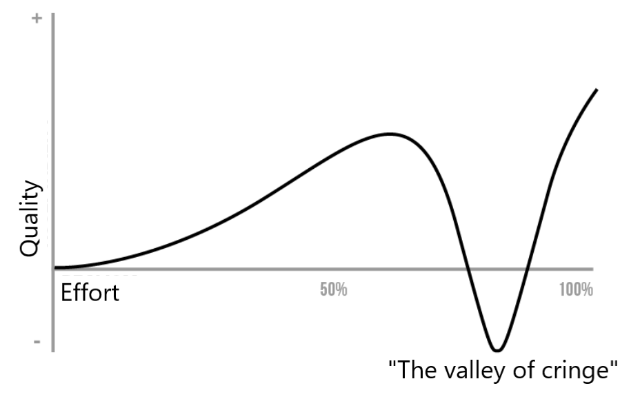 He’d put a lot effort in, but it failed again at the final hurdle: he wasn’t a cosplayer. See, it’s much like the uncanny valley graph. I have workshopped a theory that the way you look in a costume and the effort put in to making it are proportional, but not in a conventional way.